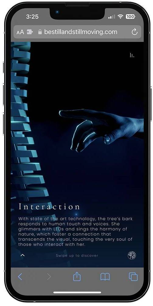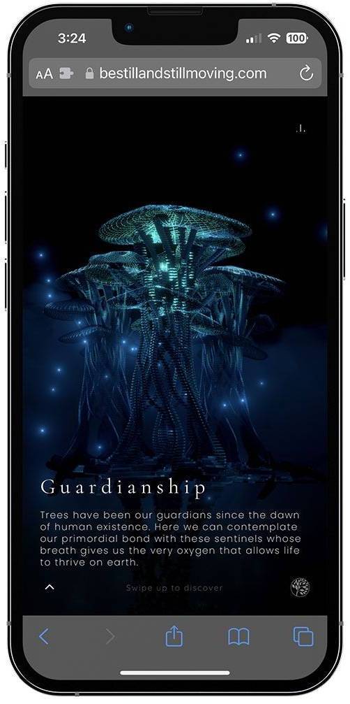 Users enter through a sleek black landing page and click “enter” to begin. A glowing bioluminescent cursor guides them through a central tree structure, where scrolling reveals sections like Purpose, Connection, Guardianship, Interaction, and more - each reflecting the brand’s identity and themes.